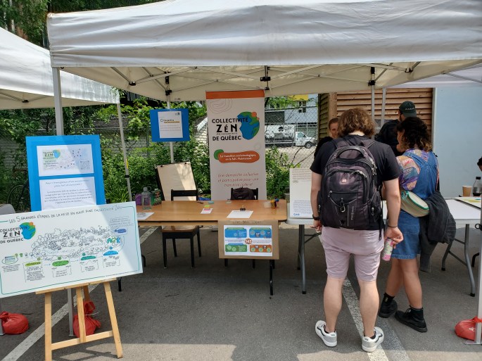 19 octobre 2023 : Nous avons tenu un kiosque au Salon du communautaire de Sainte-Foy–Sillery–Cap-Rouge organisé par le Carrefour d’actions territoriales. Le salon se tenait dans le centre commercial Place Quatre-Bourgeois avec une circulation permanente de personnes diversifiées. Nous présentions la Collectivité ZéN de Québec et notre démarche.