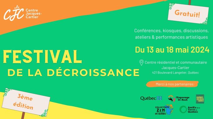 Le premier Festival de la décroissance de Québec, une initiative du Centre Jacques-Cartier, en collaboration avec de nombreux organismes, dont le Chantier ZéN – Région de Québec, a eu lieu du 13 au 19 juin 2022.
