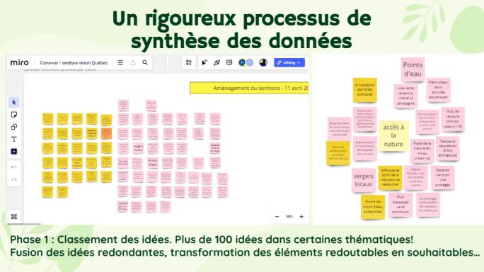 Lors d’un webinaire organisé par le Conseil régional de l’environnement de la Capitale-Nationale le 11 septembre 2024, Nadia Lemieux, chargée de projet de la Collectivité ZéN de Québec, a présenté les étapes qui ont mené à la cocréation de la vision du futur. Elle a entre autres abordé le déroulement des ateliers d’exploration du futur et le processus de synthèse des données.