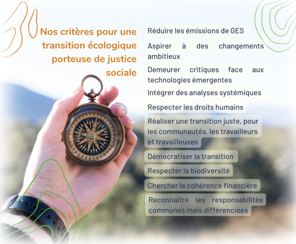 La Collectivité ZéN de Québec faisant partie du réseau des Collectivités ZéN du Front commun pour la transition énergétique (FCTÉ), nous endossons les critères définis par le FCTÉ pour assurer une transition porteuse de justice sociale :