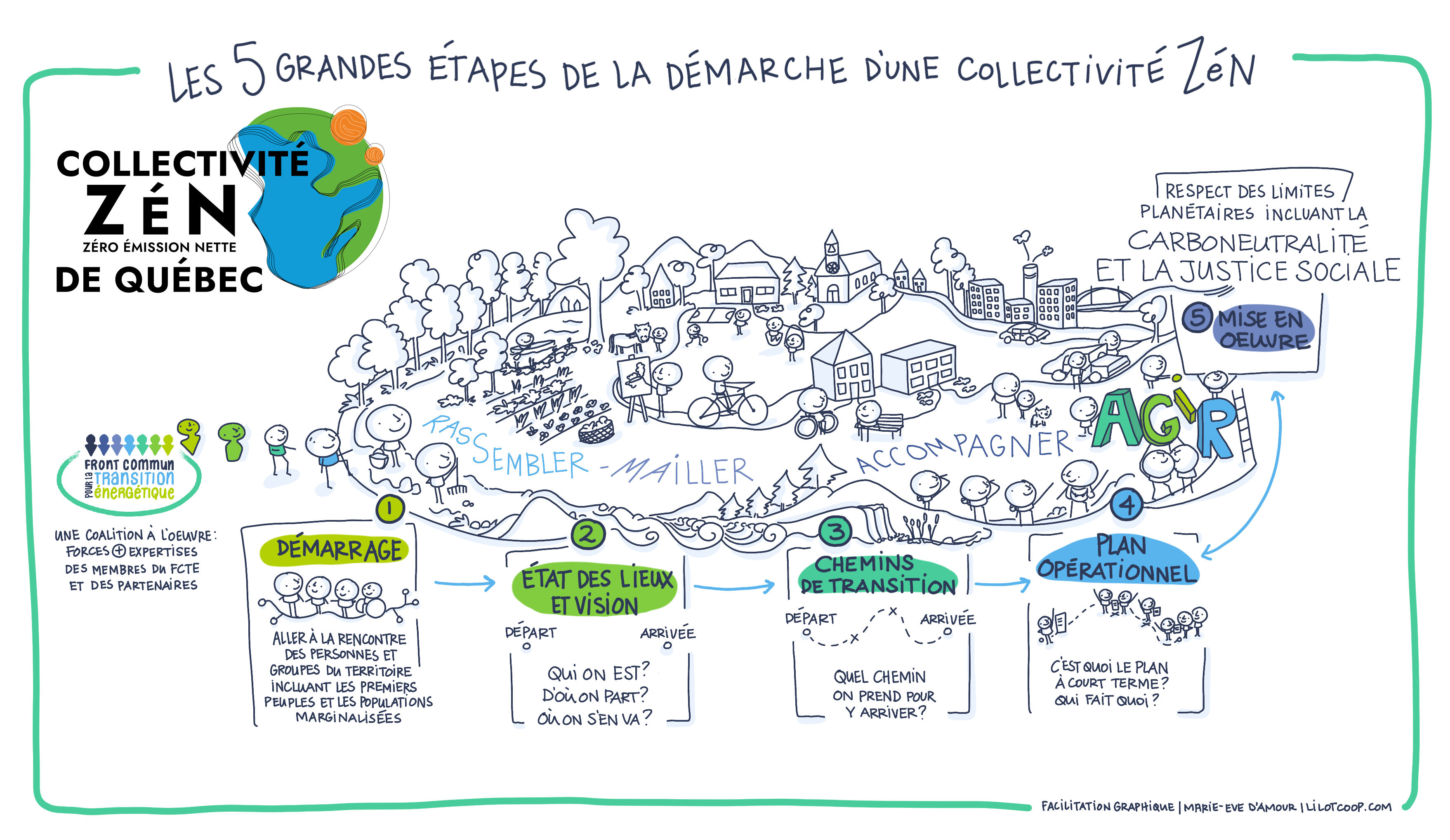 Le parcours en 5 étapes des Collectivités ZéN vise à rassembler et mobiliser les acteurs clés du territoire afin de se donner les moyens de mettre en œuvre les changements systémiques nécessaires pour réaliser la transition sociale et écologique sur notre territoire. Nous sommes accompagnés par le Front commun pour la transition énergétique (FCTÉ), par Chemin de transition et par Opération veille et soutien stratégique (OVSS).